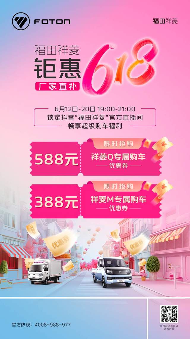 从6月1日到7月31日,福田汽车带来全系列车型的超值豪礼,优惠不断。特别是在6月17日至20日,更有福田全系产品“618钜惠狂欢”抖音直播活动,为用户献上购车狂欢,再创非凡热度,激扬夏日!