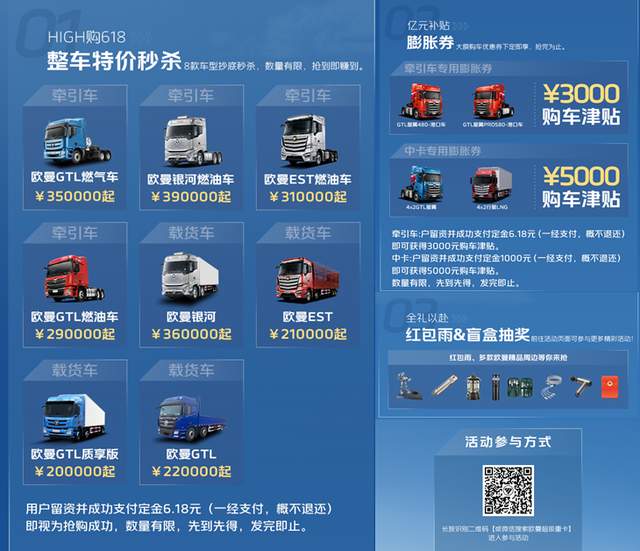 福田欧曼在6月12日至7月30日全国范围内开展“全民HIGH购618”活动,活动期间,只要用户留资并成功支付定金,就有机会享受欧曼银河、GTL、EST等8款车型的整车特价秒杀,或获得星翼港口牵引车、中卡GTL星翼及中卡行星LNG共4款明星车型的专属大额购车优惠券。优惠数量有限,先到先得,售完即止。此外,用户还有机会参与红包雨和盲盒抽奖活动,赢取多款欧曼精品周边。